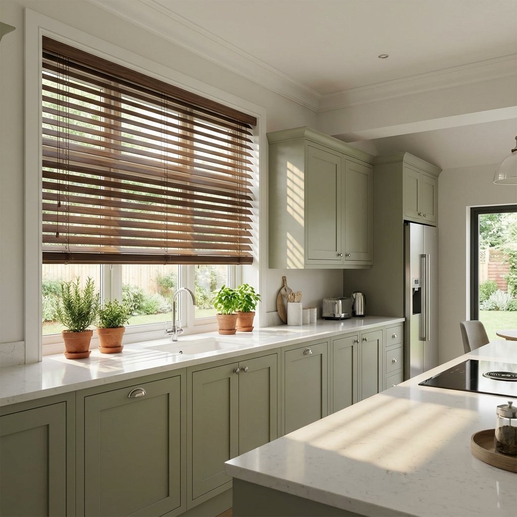 Wooden or faux-wood blinds offer clean, sharp lines that fit perfectly inside the window frame without taking up valuable wall space. They give you superior control over light direction simply by tilting the slats up or down, rather than just open or closed. This structured look is ideal for high-humidity areas like kitchens or bathrooms where fabric might suffer. Choose blinds when you need:
