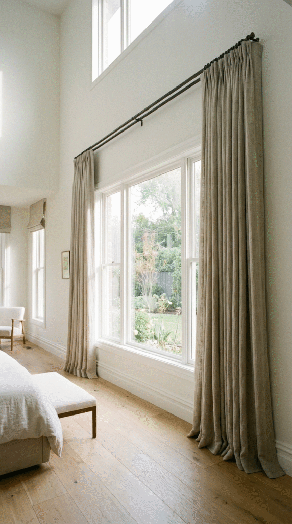 The visual impact of window treatments is dictated by how and where they are mounted. A common mistake is mounting drapery rods directly on the window frame, which can make windows appear smaller and ceilings lower. High and wide placement transforms the spatial perception of the room. Mount rods 4-6 inches above the frame (or closer to the ceiling molding) and extend them 3-6 inches past the sides.