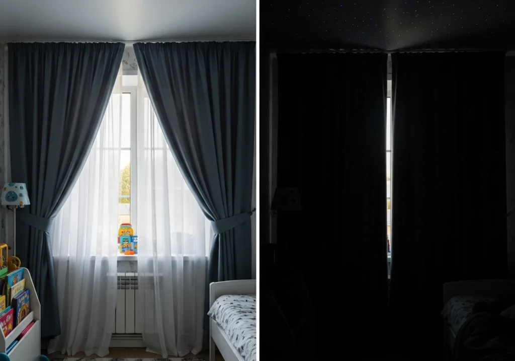That’s where layering comes in. A simple setup is sheer curtains closest to the window to soften harsh daylight, with blackout or dim-out curtains on top for serious darkness. In the morning, you open the blackout layer but keep sheers closed, so the room feels bright and private without glare.
