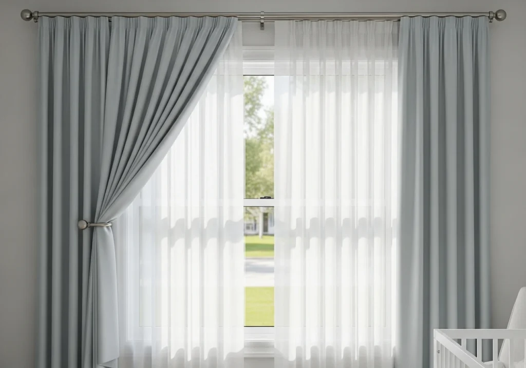 - Sheers + blackout curtains for nurseries, early sleepers, or street-facing windows.