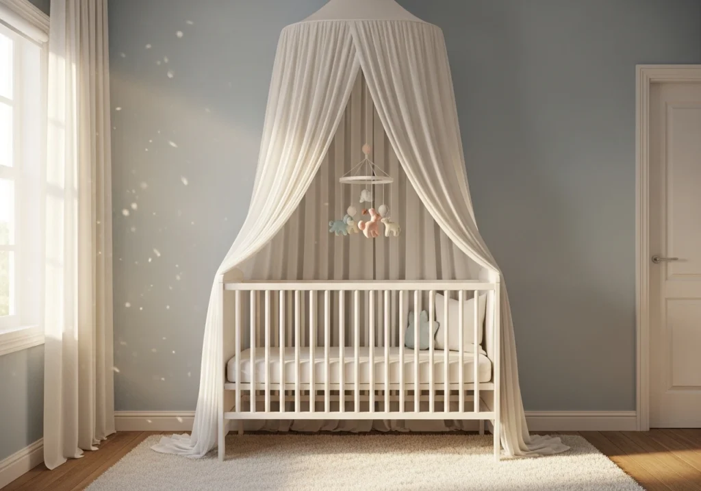 For safest results, attach the canopy securely to the ceiling or wall and keep any draped fabric outside the crib rails. As your baby becomes more mobile, tie the fabric back so it can’t be pulled down or chewed. Light, breathable materials are best, as they move gently with air but don’t feel heavy or overwhelming.
