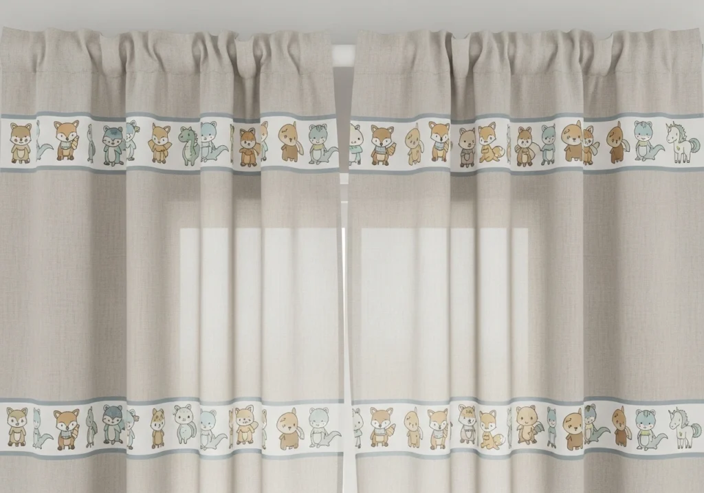 To keep things flexible, choose neutral panels with a subtle character border, printed band, or small motif instead of an all-over print. You can also bring characters in through tiebacks, a single accent panel, or a valance, while keeping the main curtains plain. That way, when your little one moves from dinosaurs to space, you’re swapping accessories, not the entire window treatment.
