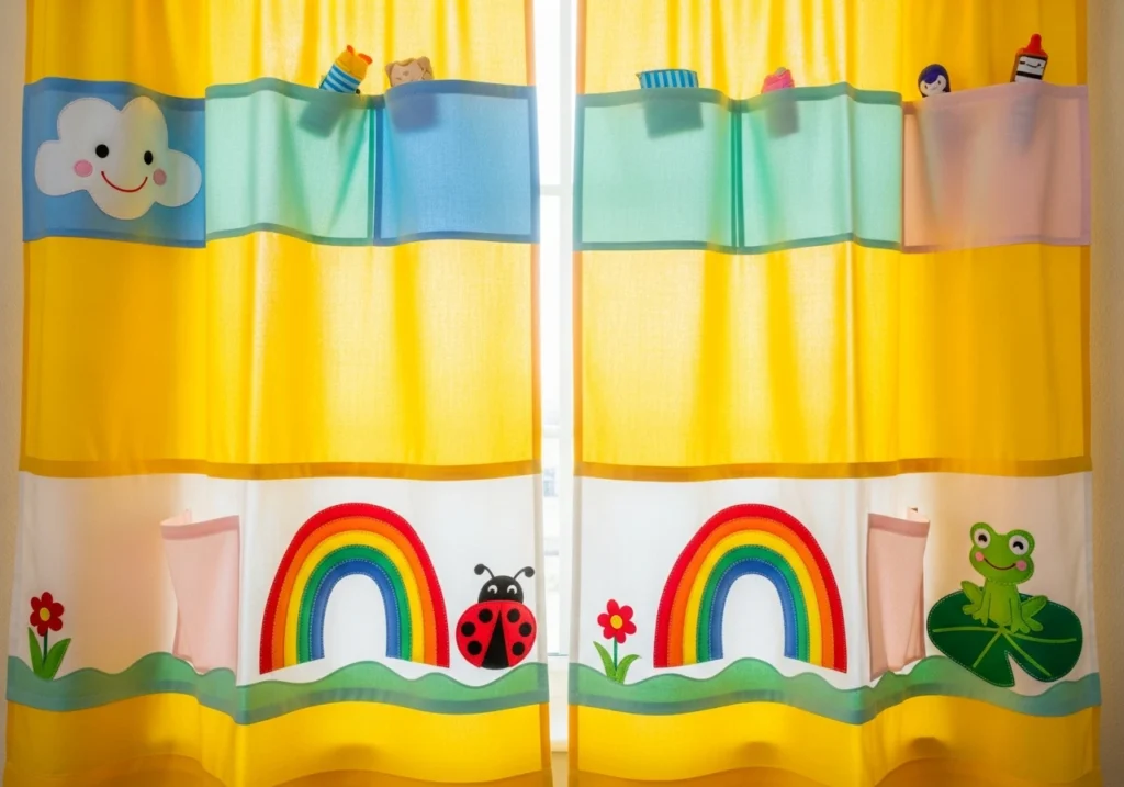 To keep things safe and tidy, choose flat, securely stitched appliqués and shallow pockets that hold soft items only—think finger puppets, fabric books, or a favourite small teddy. Avoid anything heavy or hard that could swing if the curtain moves. If your child is a climber, keep pockets low and minimal so the curtain doesn’t become a climbing wall.