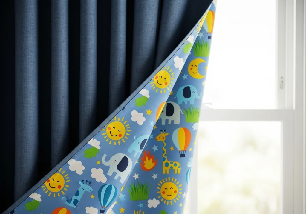Blackout curtains are a lifesaver for early-rising kids, but they don’t have to look serious or plain. One clever twist is choosing solid blackout panels on the outside with a secretly fun patterned lining on the inside. When the curtains are open, kids see bright animals, stars, or balloons; from the room, you see calm, grown-up colour.