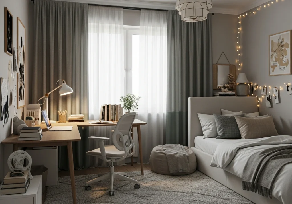 If your teen’s room is on the darker side, choose a slightly lighter neutral so the curtains don’t swallow the daylight. In brighter rooms, deeper greys or greige panels can make the space feel cosy and cocoon-like—perfect for movie marathons and late-night revision sessions.
