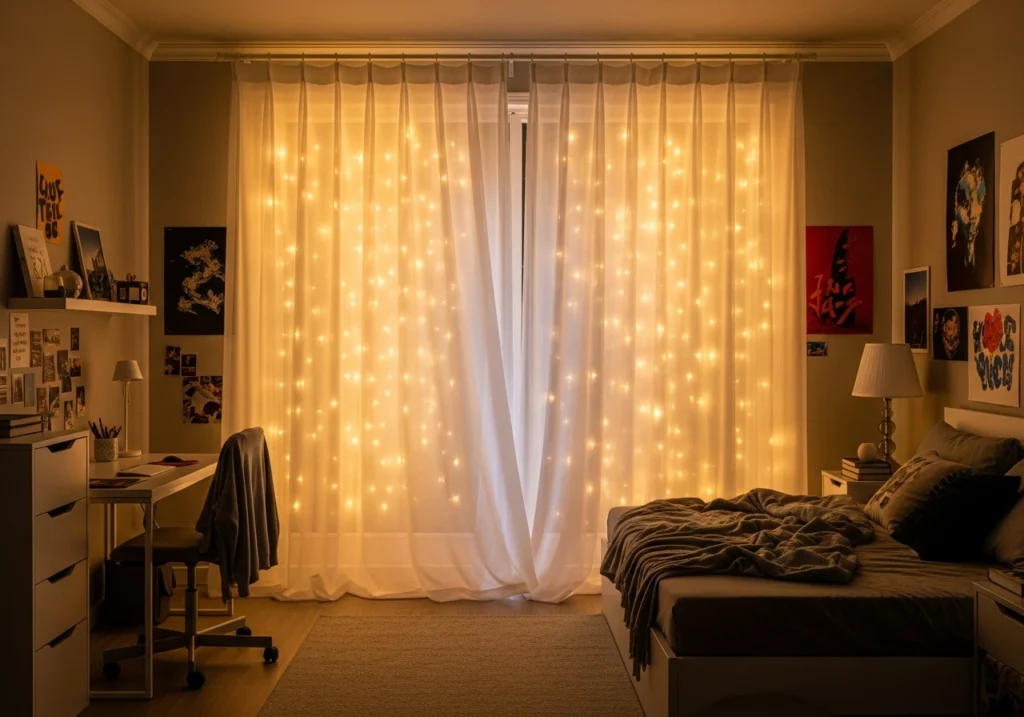 The sheer-curtains-plus-fairy-lights combo is basically teen-room magic. Soft white sheers diffuse the tiny lights so the whole window glows instead of showing individual bulbs, creating that cosy, starry-wall effect everyone loves. It instantly turns a regular bedroom into a calm evening retreat for journaling, scrolling, or hanging out with friends.