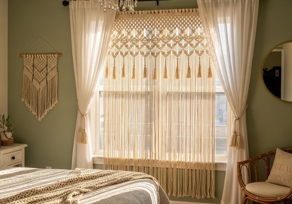 To keep things practical, use the macramé as a decorative middle layer and rely on simple sheers or roller blinds behind it for actual light control. That way your teen can enjoy the boho vibe while still being able to darken the room for sleep or screen time. Stick to a soft, neutral palette so the look feels curated, not cluttered.