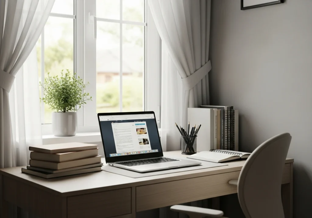 Neutral fabrics work best here because they don’t cast strong colour onto books or screens. Position the desk so the window is beside, not directly behind, your teen, then use the curtains to fine-tune brightness. A simple tieback or holdback lets them adjust panels quickly between reading, laptop work, and relaxing.