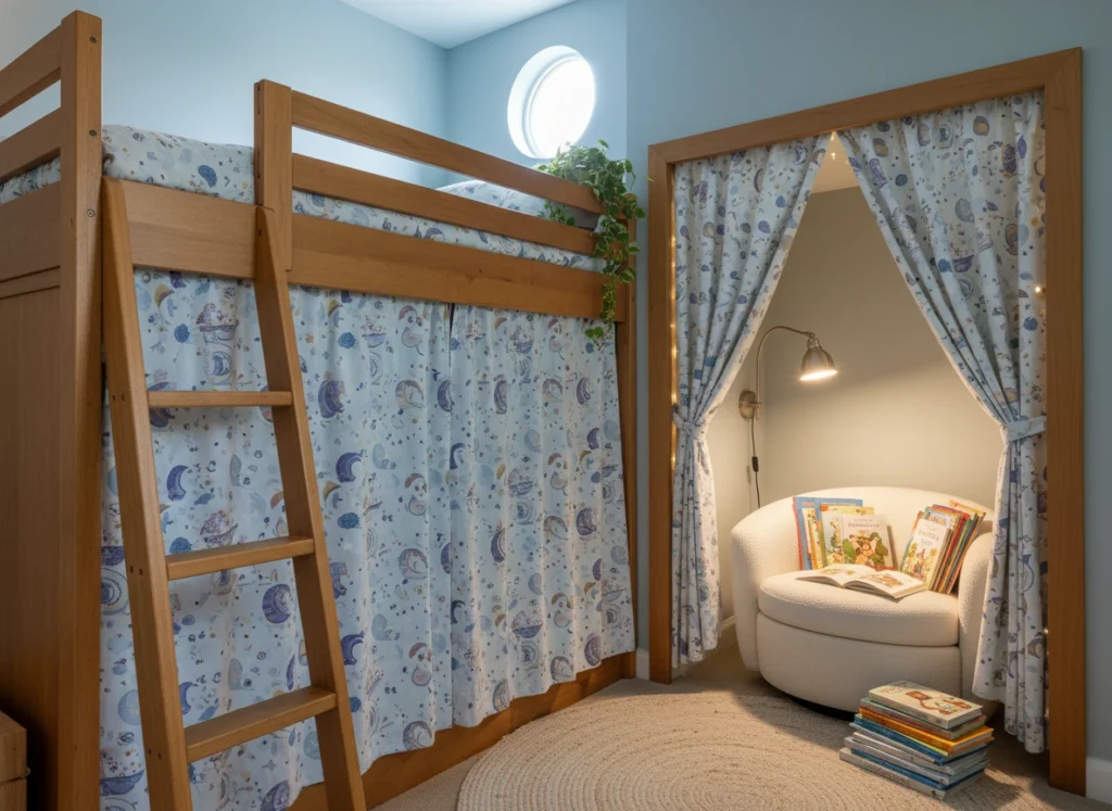 You can even coordinate prints: planets for a “space bunk,” woodland scenes for a little den, or simple spots and stripes that work for a wide age range. It’s a flexible way to add privacy and magic without taking up extra floor space.