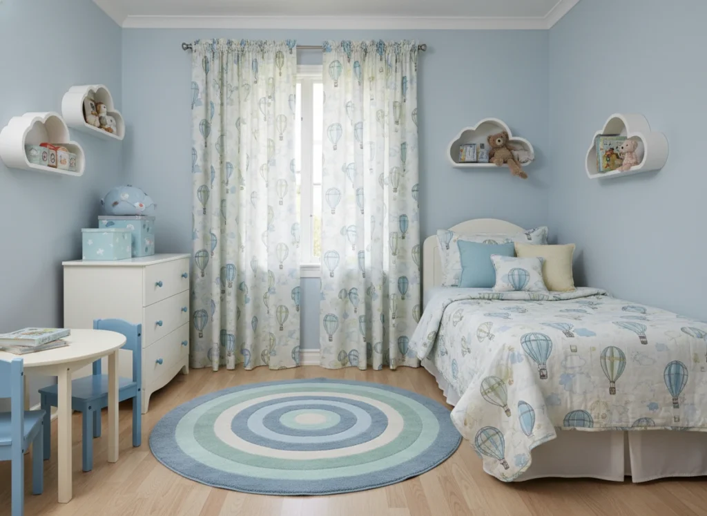 When curtains, bedding, and rugs all talk to each other, a kids room suddenly looks “put together” instead of random. The trick isn’t buying matching sets; it’s repeating colours and shapes so the eye can spot a gentle pattern. That’s why hot-air-balloon curtains with balloon bedding and a round rug in the same tones feel so satisfying.