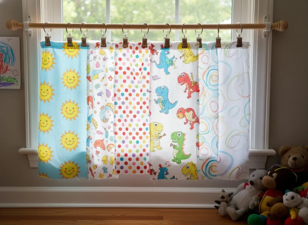 If you’re renting or just not ready for permanent choices, this approach is ideal. Clip-on panels come down in seconds for washing, and you can reuse the fabric later as cushion covers, bunting, or play-tent sides. It’s creative, flexible, and kind to your wallet.
