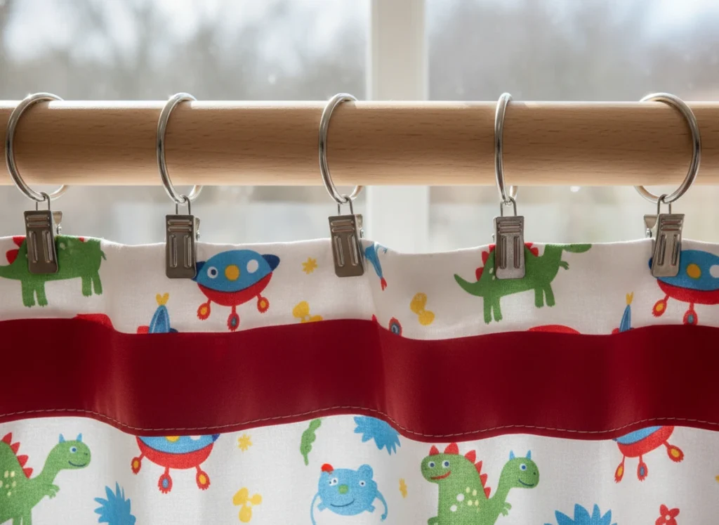 This setup is perfect for renters because you can remove everything in minutes with no permanent changes. It also makes curtain updates ridiculously simple—swap just the clipped panel for a new print when your child moves on from dinosaurs to outer space.