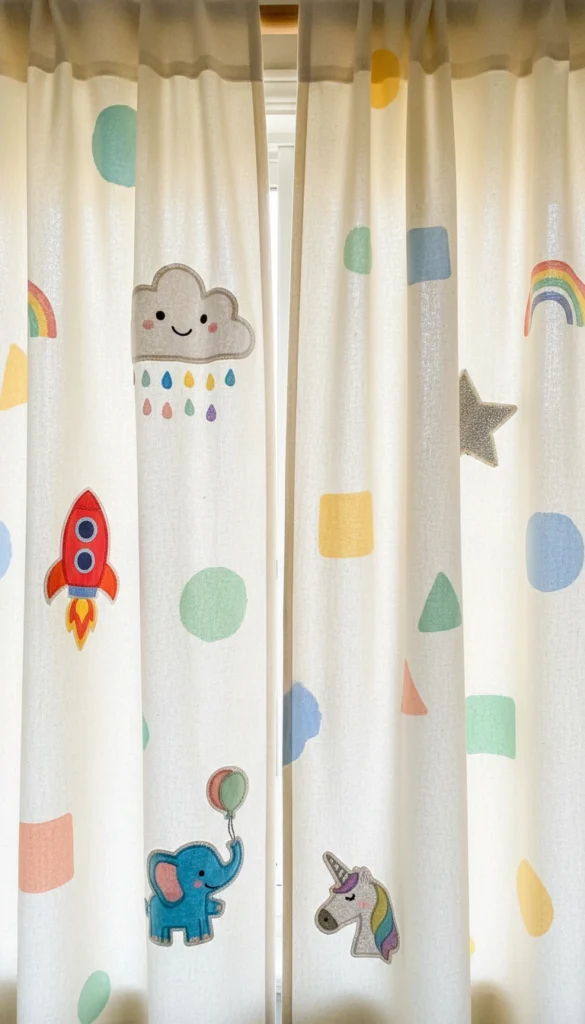 Plain curtains are the perfect blank canvas for a little personality. Iron-on patches, fabric stickers, or simple shapes painted with fabric paint can transform basic panels into something that feels totally custom. Think rockets, unicorns, clouds, and stars sprinkled across the bottom half where kids can see and enjoy them.