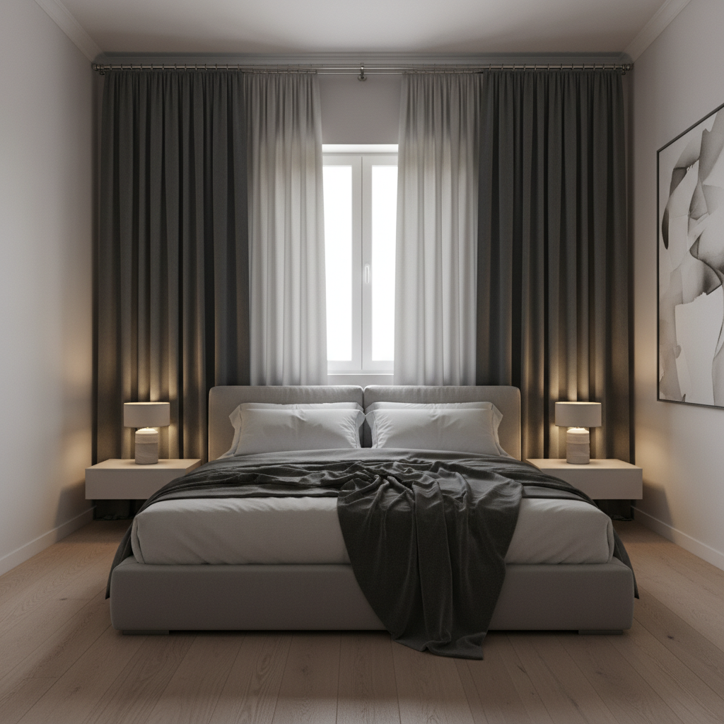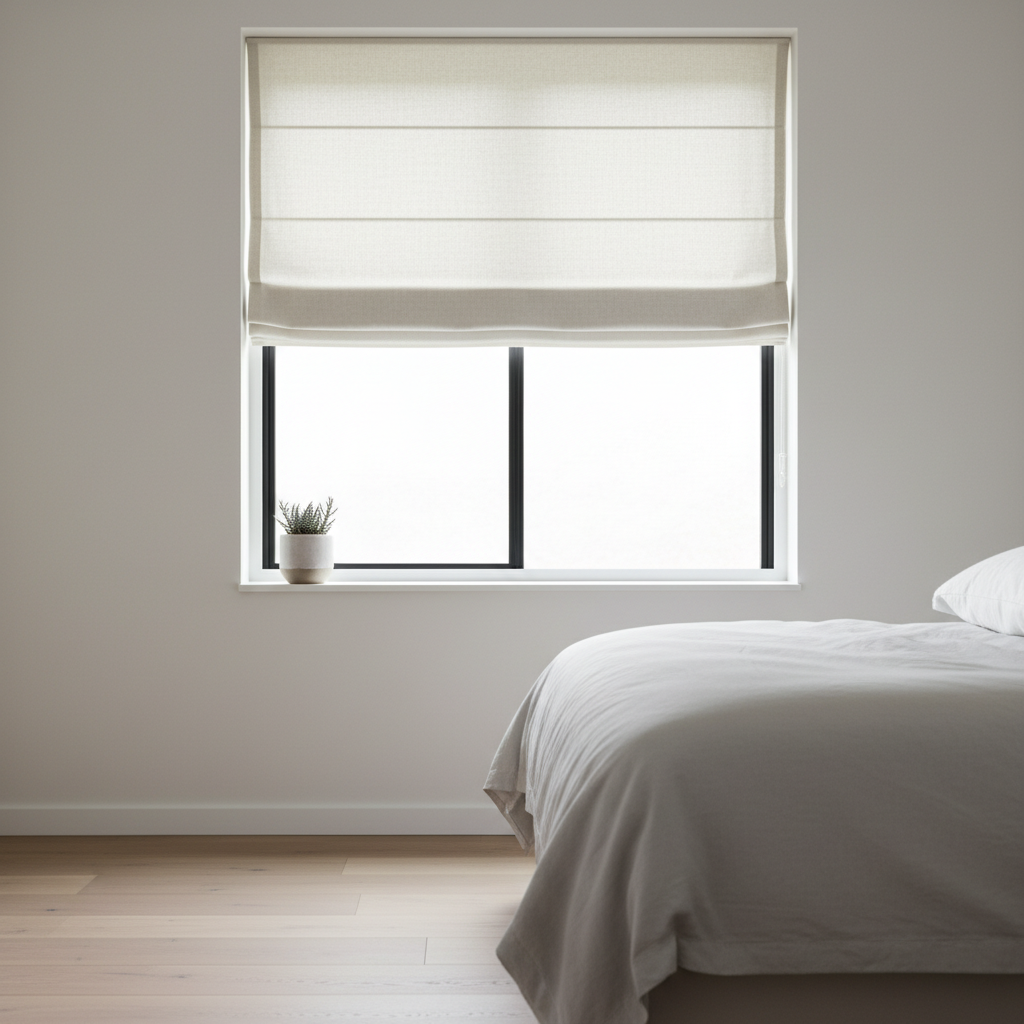 Choose flat-fold or hobbled styles for a modern, uncluttered appearance in contemporary bedrooms. This treatment works exceptionally well when desiring a minimalist window dressing that doesn’t obstruct architectural details.