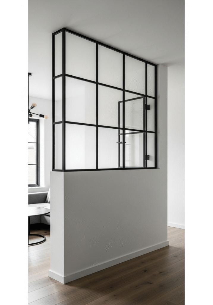 Keep the structure but lose the isolation. A pony wall (half-height) topped with steel-framed glass windows creates a dedicated “room” while preserving the open volume of the ceiling.
