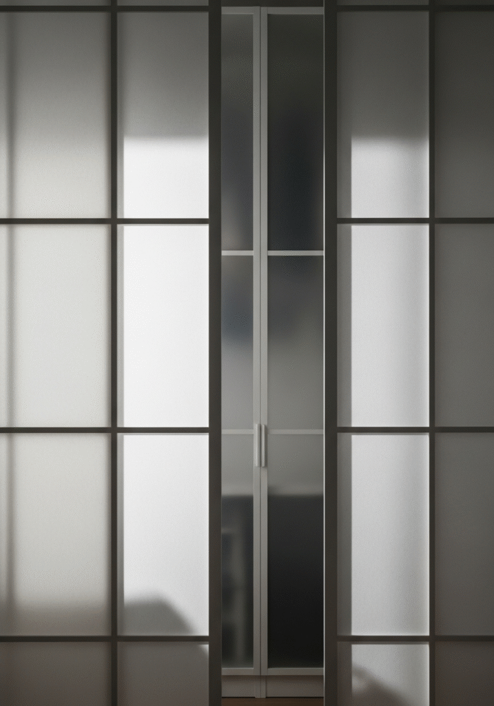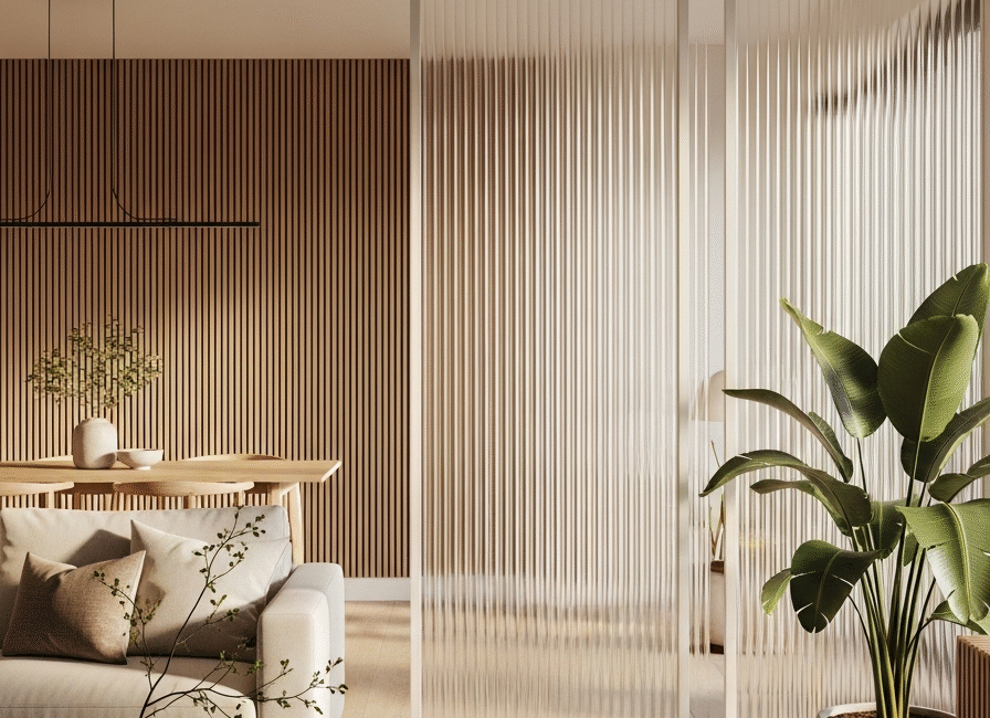 Texture is everything in 2026. Ribbed or fluted glass distorts the view just enough to hide clutter while letting light pour through. It feels incredibly high-end and retro-modern.