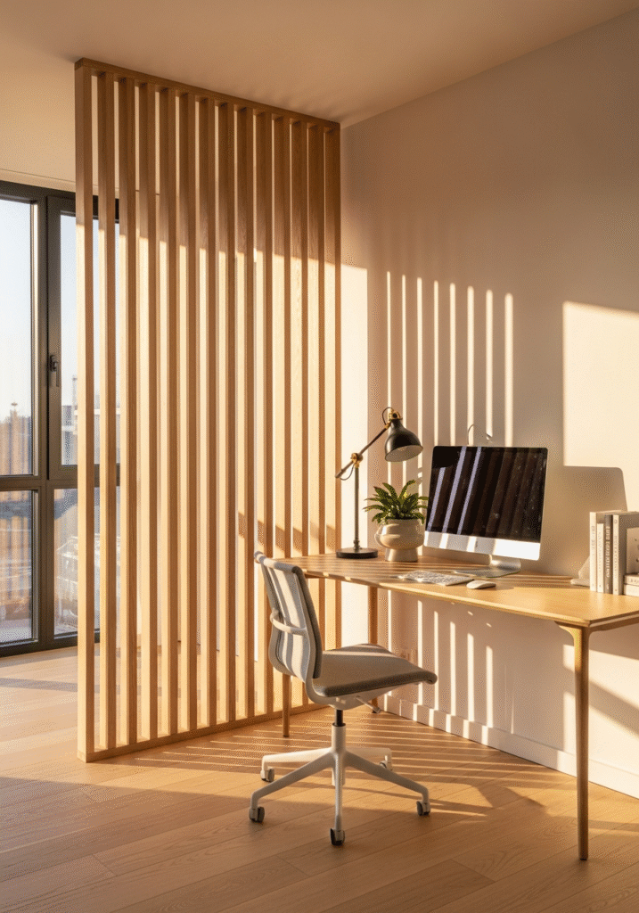 Bring architectural interest to your space with floor-to-ceiling vertical wood slats. This look defines a separate zone—like a home office—without blocking sunlight or making the room feel small.