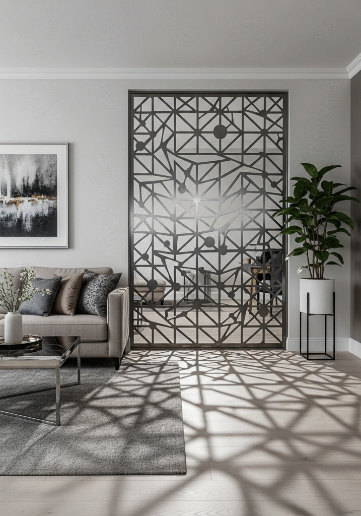 Turn your divider into art. Laser-cut metal screens with Art Deco or geometric patterns act as a focal point while separating zones.