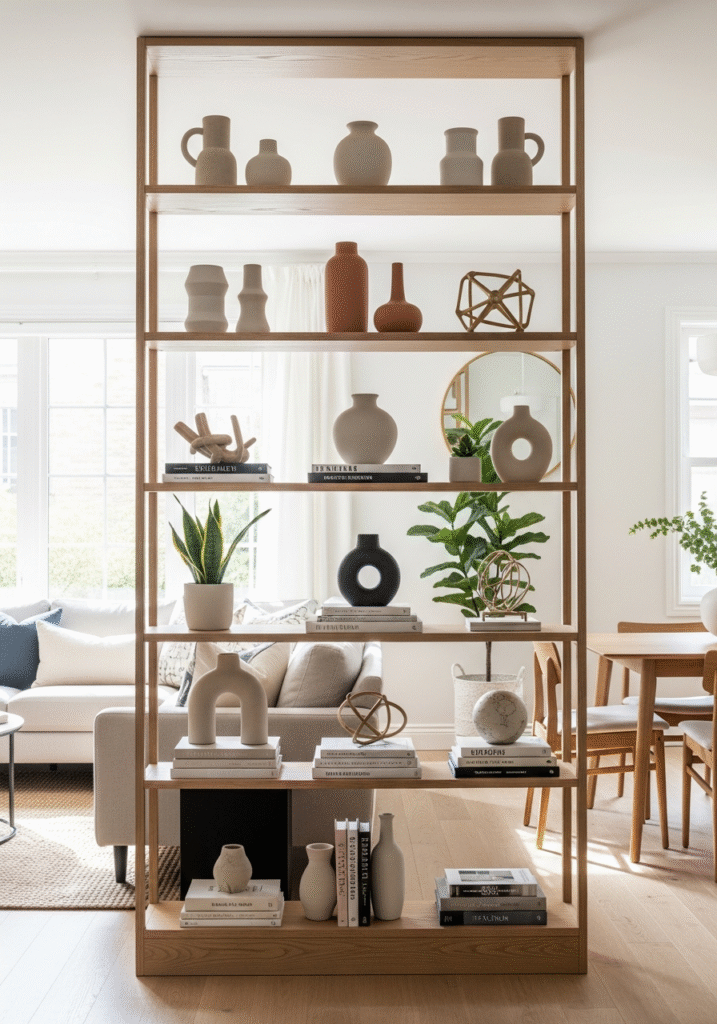 Functional meets beautiful. Use a tall, open-back shelving unit to physically split a living and dining area. It doubles as storage and a display for your curated decor.