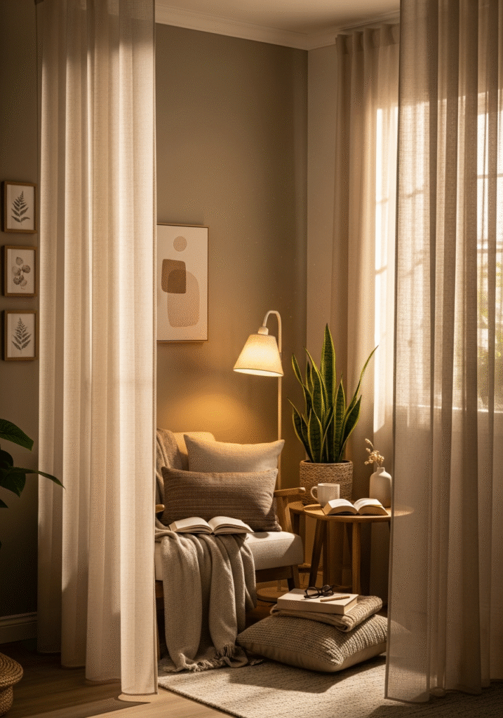Forget stiff walls; embrace the soft partition. Ceiling-mounted drapery allows you to close off a bedroom nook or reading corner instantly, then open it back up for a spacious feel.