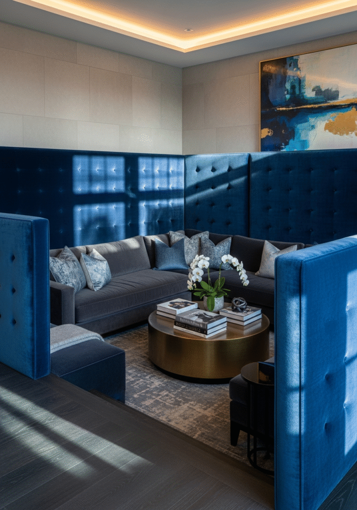 A low, upholstered divider adds softness and luxury. Instead of drywall, imagine a low barrier covered in plush velvet separating a sunken living area.