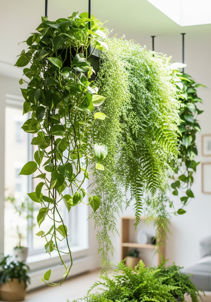 Bring the outdoors in with a cascading plant curtain. Use a ceiling-mounted rack to hang trailing pothos or ferns, creating a living, breathing wall of green.