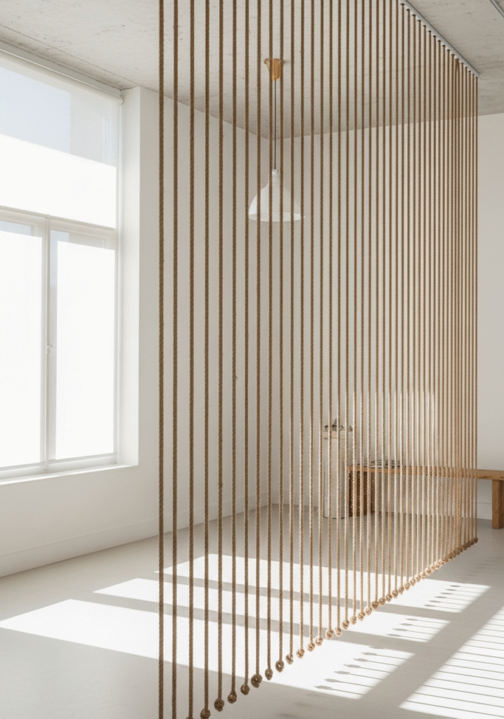 For a DIY-friendly, nautical, or rustic look, install a taut rope wall. Running thick jute ropes vertically from floor to ceiling creates a linear barrier that feels light and textural.