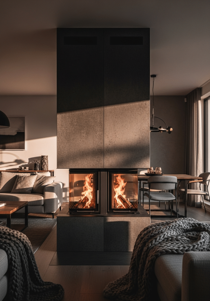 The ultimate luxury divider. A see-through gas or electric fireplace creates a cozy focal point that can be enjoyed from both the living room and the dining area simultaneously.