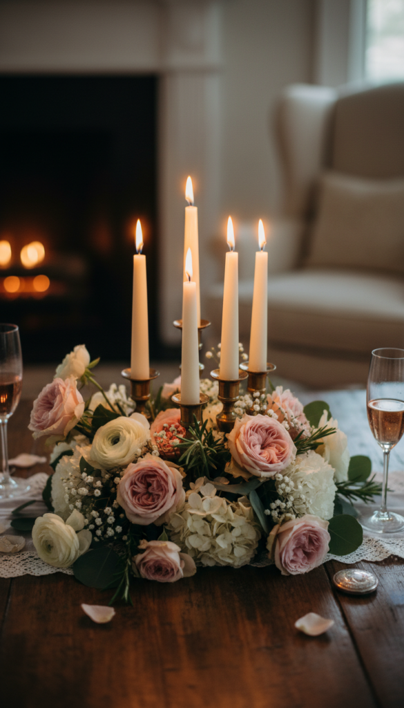 This candle-and-flower centerpiece hits that sweet spot between elegant and inviting. The soft taper candles paired with blush and ivory florals create instant warmth without feeling overdone. I’ve used a similar setup for a Valentine’s party table décor before, and guests always lean in a little closer—something about candlelight does that, doesn’t it?