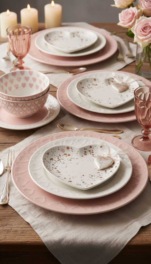 9. Valentine’s-Themed Dinnerware with Heart and Blush Details