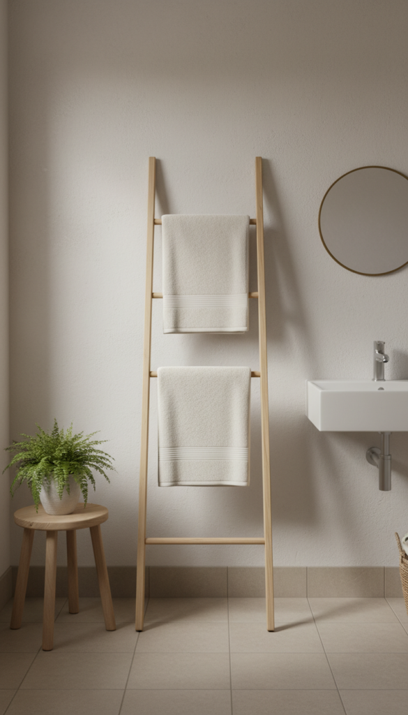 Small bathrooms love vertical storage. A freestanding towel ladder adds: