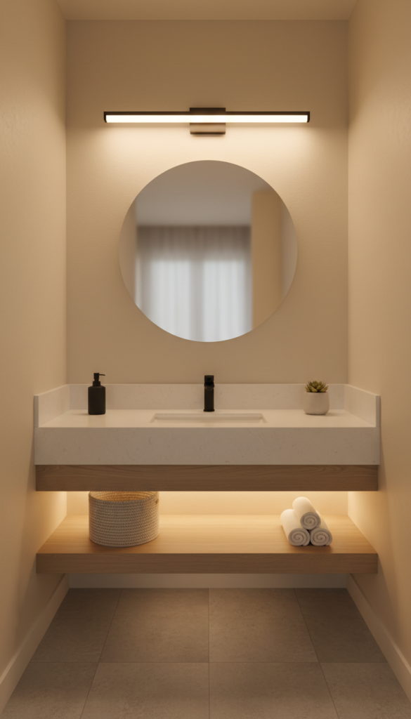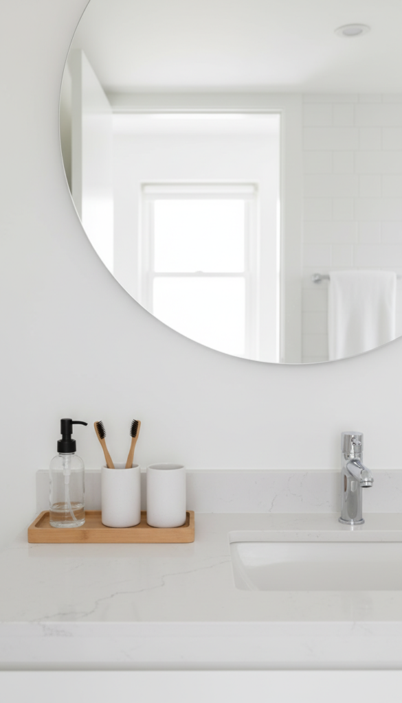Tiny bathroom truth: clear counter = bigger-looking room.
