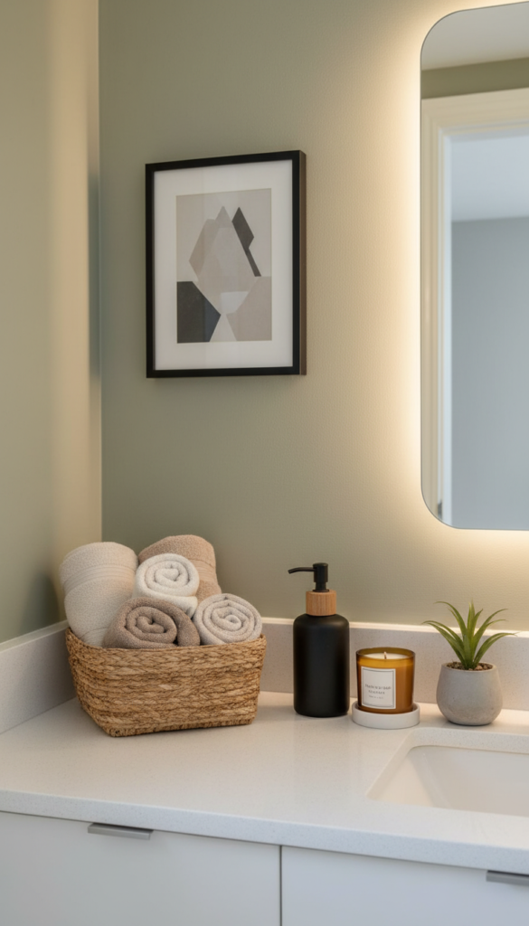 - Style the “photo zones”: vanity + mirror + towel area