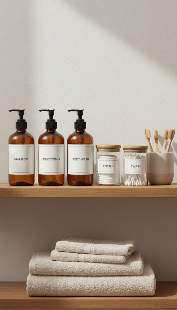 - Finish with matching dispensers and a simple tray