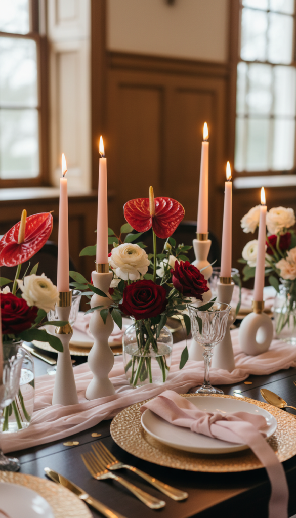 - Hero pieces: metallic chargers, sculptural candleholders, glossy red anthuriums or roses
