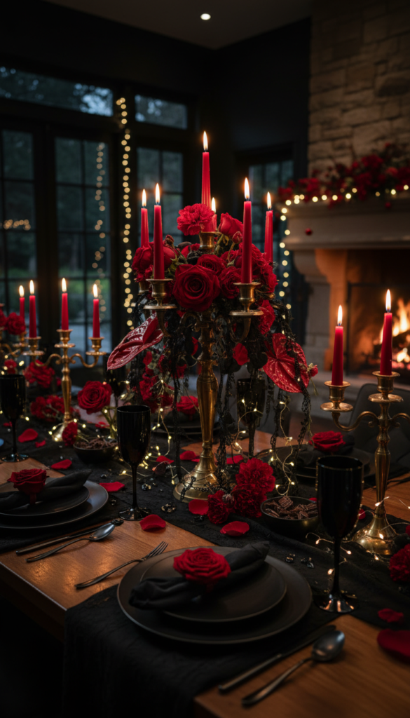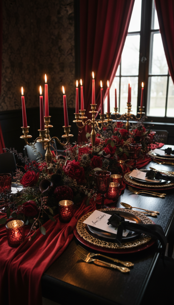 - Hero pieces: black plates, red florals, candelabras, velvet runner