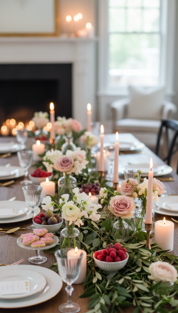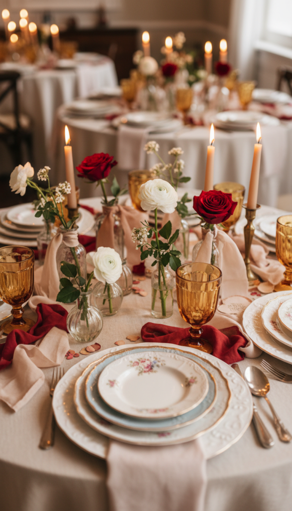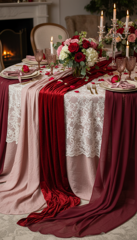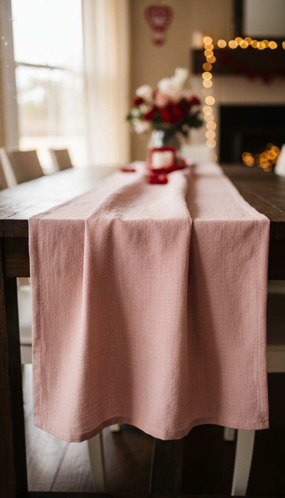 - Solid runner + patterned napkins (hearts, florals, or subtle stripes)