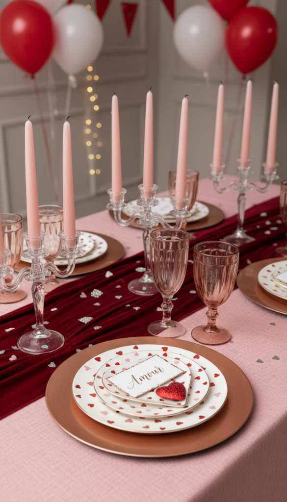 The most successful Valentine party tables don’t rely on a single gimmick. They layer:
