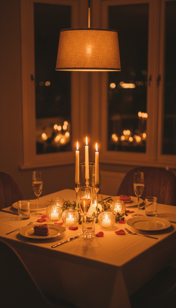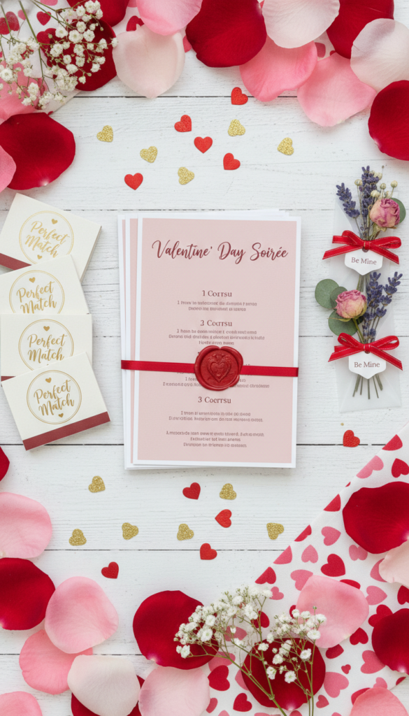 Finishing touch: sprinkle a small amount of reflective detail—tiny mirrored tiles, metallic confetti hearts, or pearl-like beads—only where candlelight can catch it.