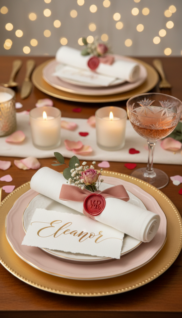 - Wax-sealed name cards: romantic and luxe