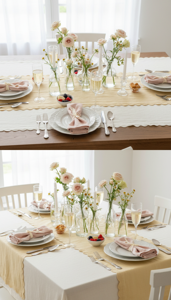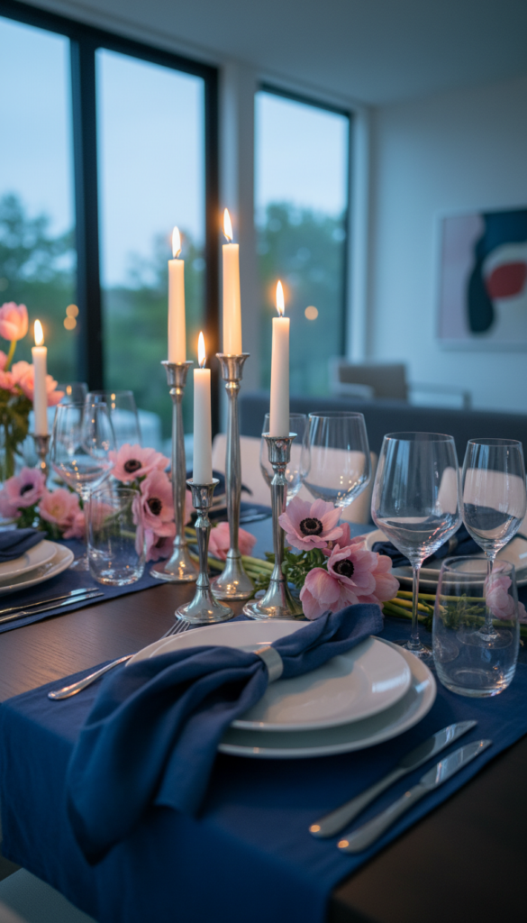 - A candle-first tablescape: cluster tapers of different heights, then tuck flowers between.