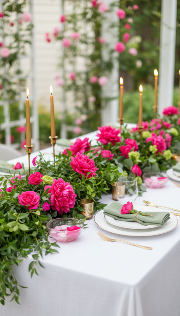 - A greenery runner (eucalyptus, ruscus) with pink blooms woven through.