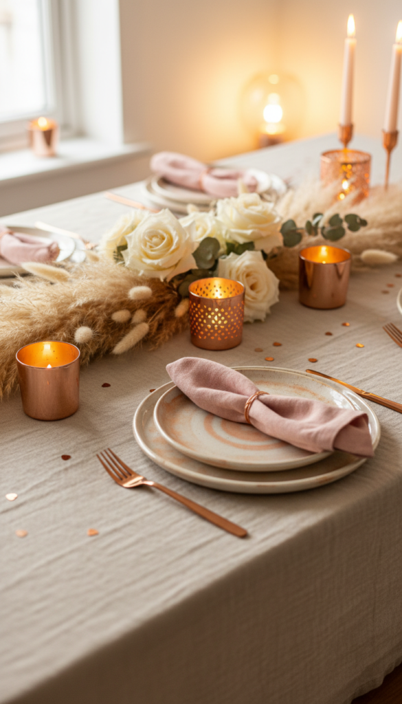 - Accent: copper votives + warm tea lights