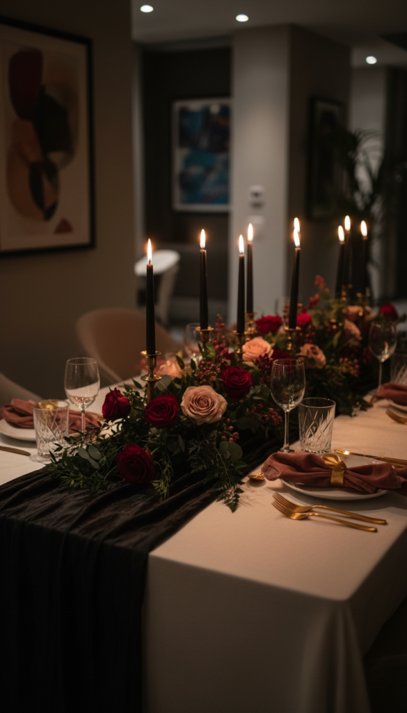 Black instantly makes the table feel grown-up and cinematic. Add rose tones and gold, and you get high-impact romance—perfect for evening hosting.