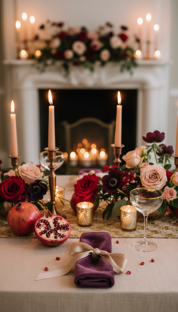 - Pomegranate scatter + roses: cut a few pomegranates and let the jewel tones do the work.