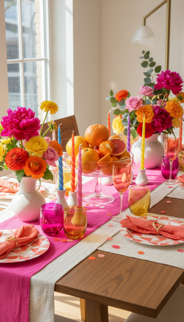 Make it feel polished: Limit yourself to three bright tones max and repeat them evenly across the table.