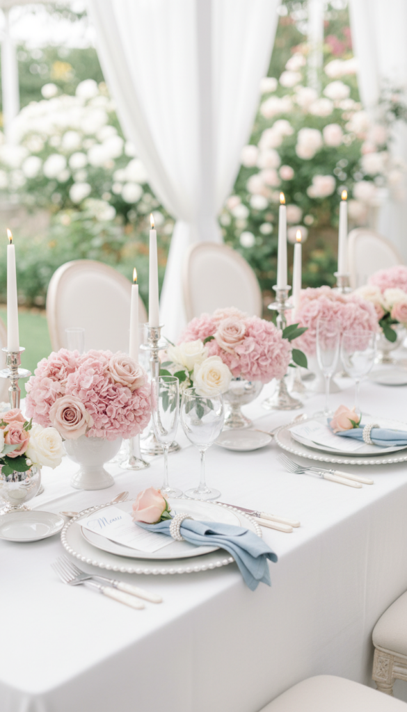 - Secondary: powder-blue napkins + blush florals