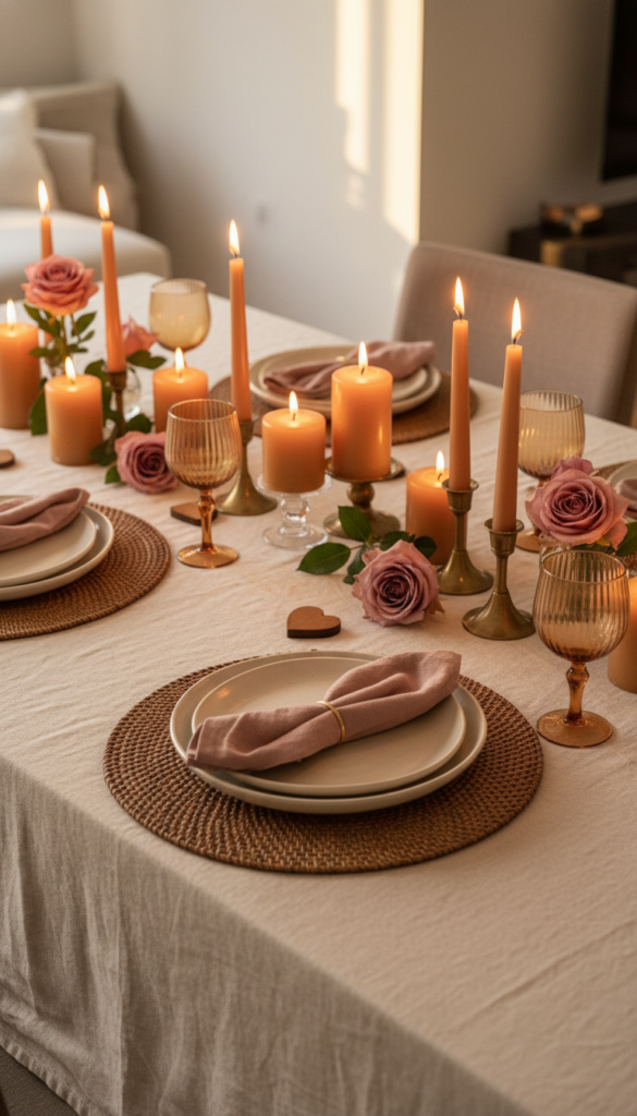 - Candle clusters in warm neutrals with a few roses tucked in—simple, expensive-looking, and extremely photogenic.